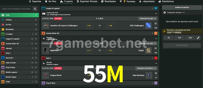 O 55M oferece uma grande seleção de opções de apostas em e-sports com probabilidades competitivas